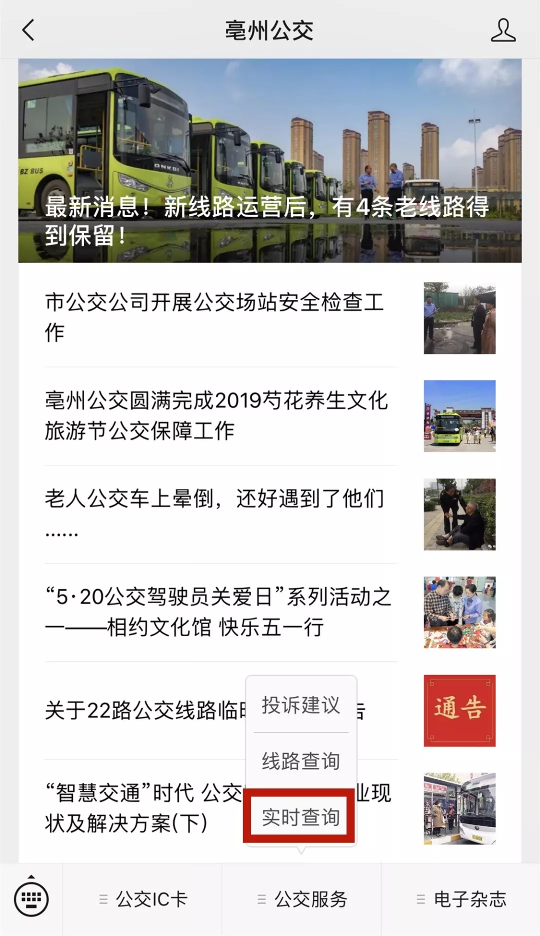 進(jìn)入“亳州公交”公眾號首頁,點(diǎn)擊“公交服務(wù)”欄中的“實(shí)時查詢”。
