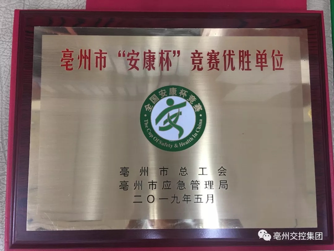 交控集團(tuán)榮獲亳州市“安康杯”競賽優(yōu)勝單位;亳州公共交通有限責(zé)任公司、亳州市公務(wù)用車調(diào)度中心榮獲亳州市“安康杯”競賽優(yōu)秀組織單位;交控集團(tuán)安委辦徐玉春同志、安徽安行天下駕駛培訓(xùn)股份有限公司朱明義同志、亳州建設(shè)安天汽車貿(mào)易服務(wù)徐賽同志榮獲亳州市“安康杯”競賽先進(jìn)個(gè)人稱號(hào)。