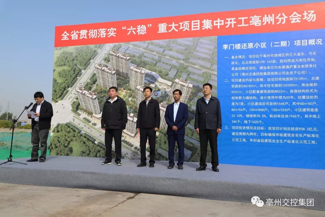 10月28日上午,市貫徹落實(shí)“六穩(wěn)”重大項(xiàng)目集中開(kāi)工儀式在譙城區(qū)李門樓還原小區(qū)項(xiàng)目現(xiàn)場(chǎng)舉行。市委常委、常務(wù)副市長(zhǎng)李軍,市政府副秘書(shū)長(zhǎng)劉巖,市直有關(guān)單位主要負(fù)責(zé)人,各縣區(qū)政府分管負(fù)責(zé)人,集團(tuán)黨委副書(shū)記、總經(jīng)理劉超,財(cái)務(wù)總監(jiān)董雷出席開(kāi)工儀式。