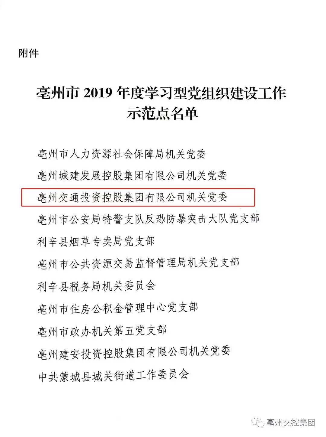 近日,中共亳州市委宣傳部印發(fā)了《關于授予市人力資源社會保障局機關黨委等11個黨組織為2019年度學習型黨組織建設工作示范點的通知》(亳宣通〔2019〕31號)文件,交控集團機關黨委榮獲全市“2019年度學習型黨組織建設工作示范點”稱號。