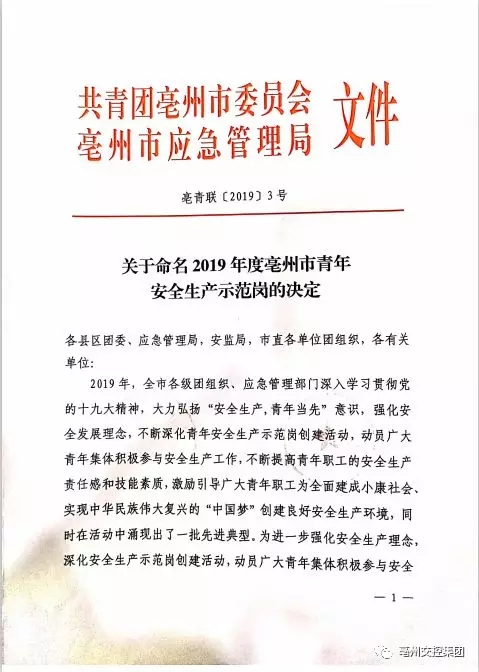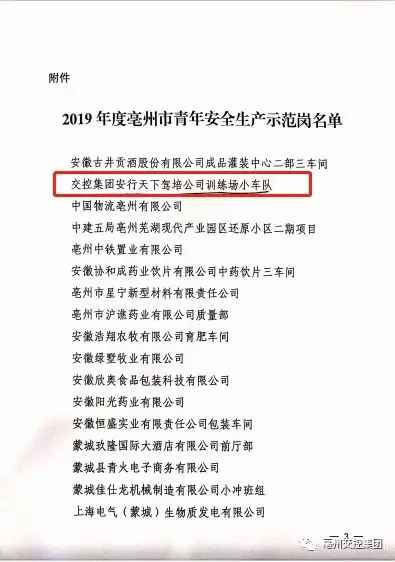近日,團(tuán)市委、市應(yīng)急管理局印發(fā)了《關(guān)于命名2019年度亳州市青年安全生產(chǎn)示范崗的決定》,授予21個(gè)創(chuàng)建集體為2019年度亳州市青年安全生產(chǎn)示范崗,集團(tuán)團(tuán)委推薦的安行天下駕培公司訓(xùn)練場(chǎng)小車隊(duì)名列其中。