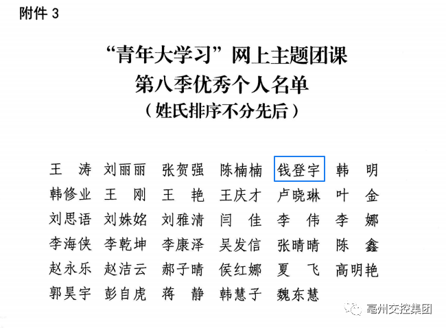近日,團(tuán)市委印發(fā)了《關(guān)于青年大學(xué)習(xí)網(wǎng)上主題團(tuán)課第八季開展情況的通報(bào)》,在47家市直單位(企業(yè))中評(píng)選出了4家優(yōu)秀團(tuán)組織,集團(tuán)名列其中;通達(dá)利公司錢登宇獲評(píng)優(yōu)秀個(gè)人。