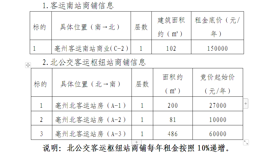 (一)項目概況與實施范圍:安徽通享交通科技有限公司擬對亳州客運(yùn)南站及北公交客運(yùn)樞紐站商鋪進(jìn)行招租,位置、面積、競價起始價等具體情況如下表所示:
