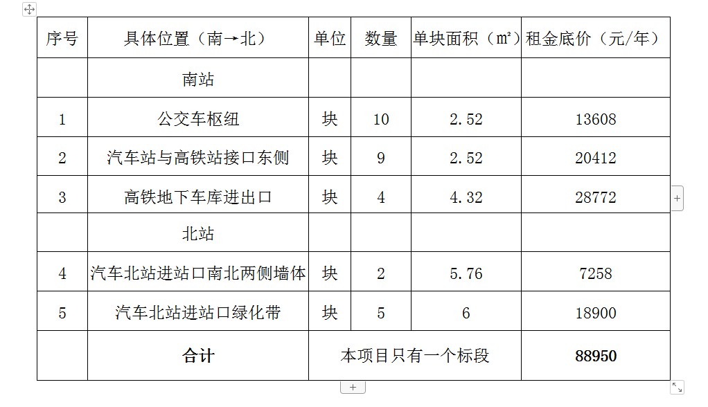 (一)項目概況:安徽通享交通科技有限公司擬對亳州高鐵客運樞紐站及亳州北客運站新開發(fā)廣告位進行招租,位置、面積、競價起始價等具體情況如下表所示: