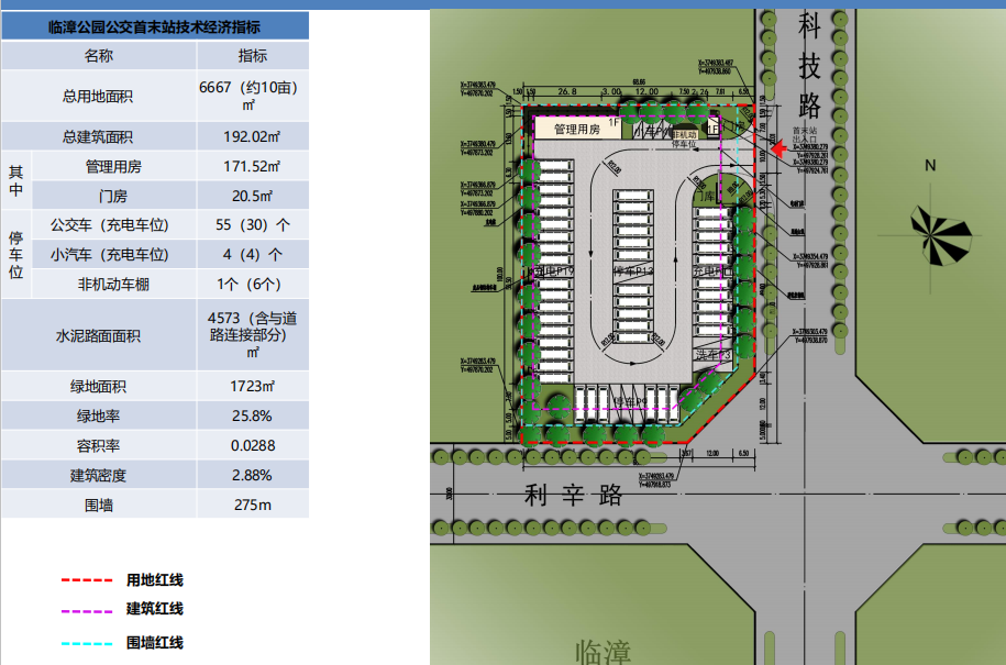 臨漳公園公交首末站位于科技路與利辛路交叉口西北角臨漳公園北側,總用地面積6667平方米,總建筑面積192.02平方米,主要包括門衛(wèi)室、路隊長室、休息室、餐廳、維修工具間、衛(wèi)生間等,設置公交車停車位55個,充電樁30個,預計11月份可投入使用。