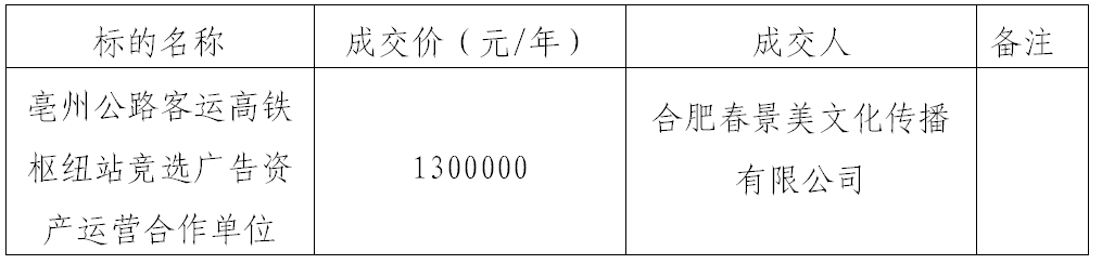 亳州公路客運高鐵樞紐站競選廣告資產(chǎn)運營合作單位項目(項目編號:BZJK-2020-069號)于2020年12月18日9時00分進行公開競價,現(xiàn)競價工作已結(jié)束,并經(jīng)采購人確認,將競價結(jié)果公示如下: