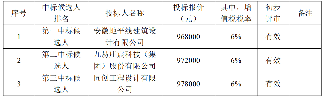 經(jīng)招標人研究,確定安徽地平線建筑設(shè)計有限公司為中標人,中標價(大寫)玖拾陸萬捌仟元整,(小寫)968000元,其中增值稅稅率為6%。
