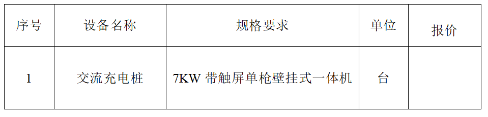 (二)詢價(jià)范圍:為詢價(jià)人提供7KW交流充電樁的供貨、包裝、運(yùn)輸、售后服務(wù)、技術(shù)支持等。設(shè)備參數(shù)、規(guī)格及要求詳見(jiàn)供貨要求。