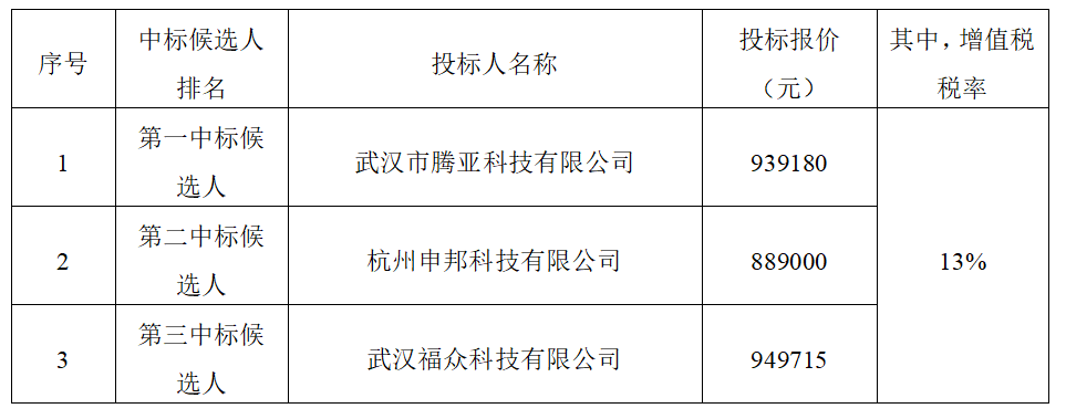 根據(jù)有關規(guī)定,招標人確定武漢市騰亞科技有限公司為中標人,中標價為人民幣(大寫)玖拾叁萬玖仟壹佰捌拾元,人民幣(小寫)939180元,按合同約定完成本項目投標產(chǎn)品的供貨、運輸、裝卸、調(diào)試、售后服務以及配套設施建設等工作。