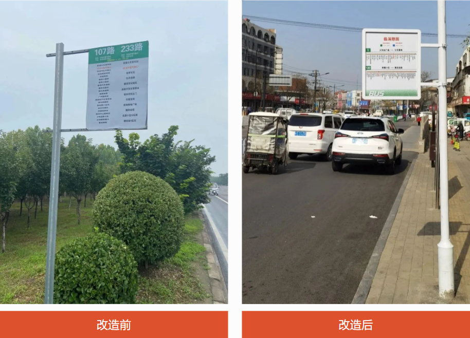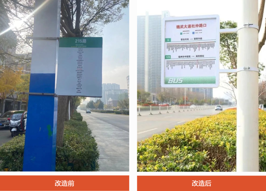 舊站牌為簡易鐵皮式,長期日曬雨淋會導(dǎo)致張貼的線路圖脫落,影響美觀,也不便于市民瀏覽。升級改造后的公交站牌采用內(nèi)嵌式結(jié)構(gòu),材料是鍍鋅板焊接不銹鋼管,連接部分使用抱箍固定,不僅安全穩(wěn)固,而且外形美觀、信息明了,能夠?yàn)槌丝吞峁└忧逦某塑囍敢?wù)。