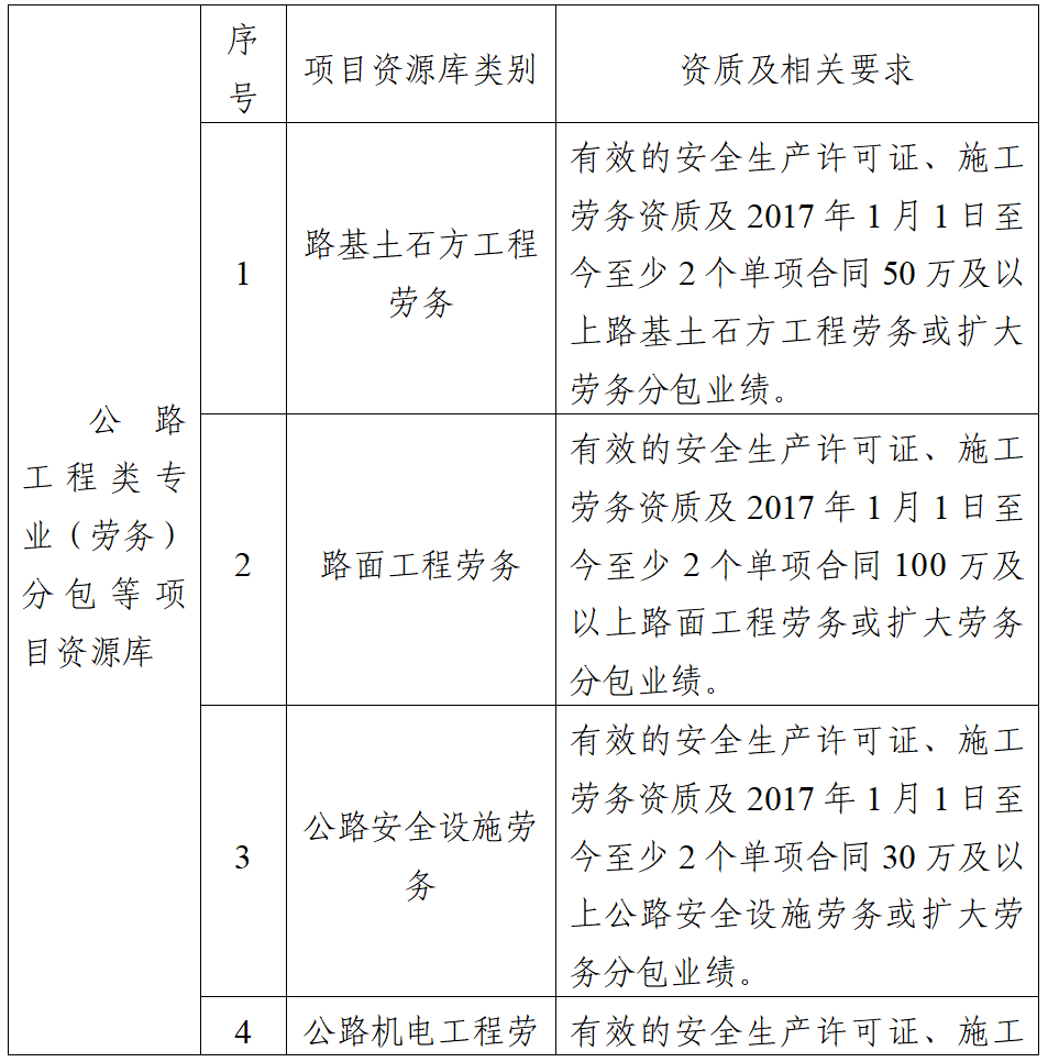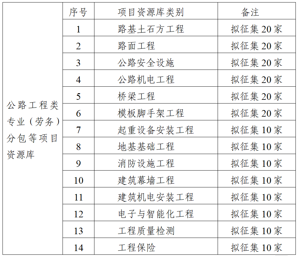 (一)項目概況:為保證公路工程等項目的招標效率和質量,安徽通康建設結合實際情況,擬建立安徽通康建設工程有限公司專業(yè)(勞務)分包項目資源庫。根據(jù)有關法律法規(guī),現(xiàn)面向社會公開征集公路工程類專業(yè)(勞務)分包等項目資源庫供應商。