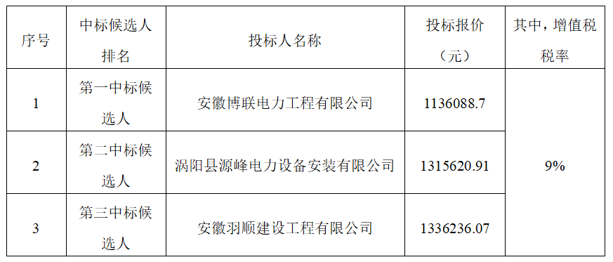 根據(jù)有關(guān)規(guī)定,招標(biāo)人確定安徽博聯(lián)電力工程有限公司為中標(biāo)人,中標(biāo)價為人民幣(大寫)壹佰壹拾叁萬陸仟零捌拾捌元柒角,(小寫)1136088.7元,工期30日歷天,按合同約定實(shí)施和完成承包工程,修補(bǔ)工程中的任何缺陷,工程質(zhì)量符合國家、地方、行業(yè)現(xiàn)行相關(guān)規(guī)范合格標(biāo)準(zhǔn),符合設(shè)計圖紙、圖集規(guī)定標(biāo)準(zhǔn),通過供電主管部門驗(yàn)收,滿足招標(biāo)文件第五章技術(shù)標(biāo)準(zhǔn)和要求。