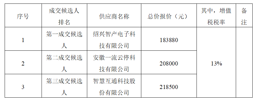 根據(jù)有關(guān)規(guī)定,采購人確定紹興智產(chǎn)電子科技有限公司為成交人,總價(jià)成交價(jià)(大寫)壹拾捌萬叁仟捌佰捌拾元整,(小寫)183880元(其中,增值稅稅率為13%),交貨期:自合同簽訂之日起7日歷天內(nèi)完成供貨、安裝、調(diào)試工作,并與采購人智慧停車管理平臺(tái)完成對(duì)接,質(zhì)量標(biāo)準(zhǔn):符合國家、地方、行業(yè)現(xiàn)行相關(guān)規(guī)范合格標(biāo)準(zhǔn),符合附件采購清單要求,按合同約定完成全部工作。