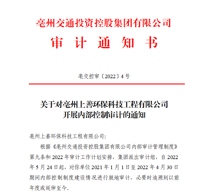 為進(jìn)一步加強(qiáng)和規(guī)范企業(yè)內(nèi)部控制,提高公司經(jīng)營管理水平和風(fēng)險(xiǎn)防范能力,近期,集團(tuán)派出審計(jì)組對亳州上善環(huán)保科技有限公司開展內(nèi)部控制專項(xiàng)審計(jì),目前已完成現(xiàn)場審計(jì)工作。