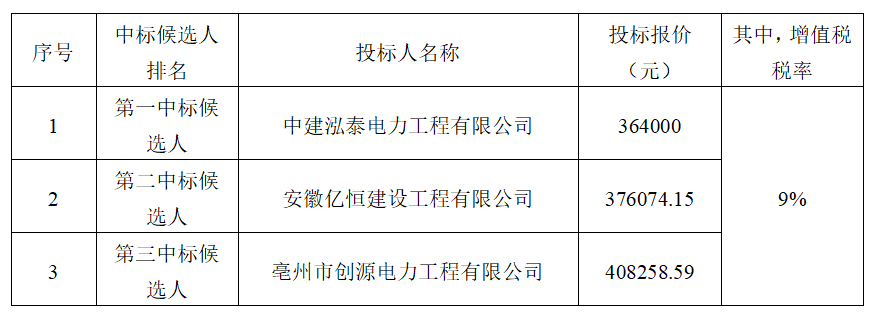 根據(jù)有關(guān)規(guī)定,招標人確定中建泓泰電力工程有限公司為中標人,中標價為人民幣(大寫)叁拾陸萬肆仟元整,(小寫)364000元(其中,增值稅稅率為9%),工期30日歷天,按合同約定實施和完成承包工程,修補工程中的任何缺陷,工程質(zhì)量符合國家、地方、行業(yè)現(xiàn)行相關(guān)規(guī)范合格標準,符合設計圖紙、圖集規(guī)定標準,通過供電主管部門驗收,滿足招標文件第五章技術(shù)標準和要求。
