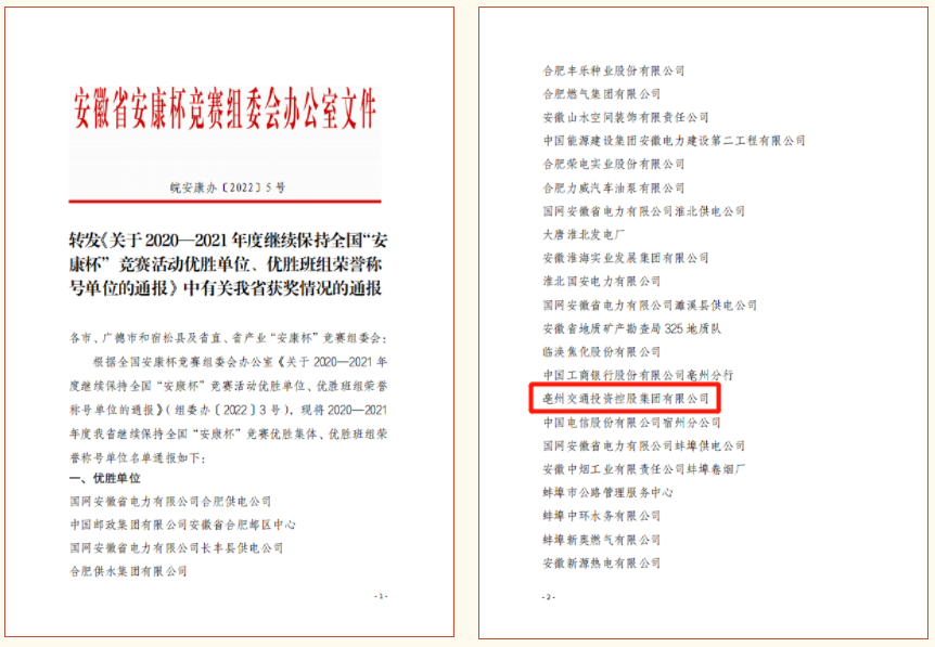 近日,根據(jù)全國“安康杯”競賽組委會《關于2020-2021年度繼續(xù)保持全國“安康杯”競賽活動優(yōu)勝單位、優(yōu)勝班組榮譽稱號單位的通報》,交控集團順利通過復評,繼續(xù)保持全國“安康杯”競賽優(yōu)勝單位榮譽稱號,這是交控集團連續(xù)兩次獲此殊榮!