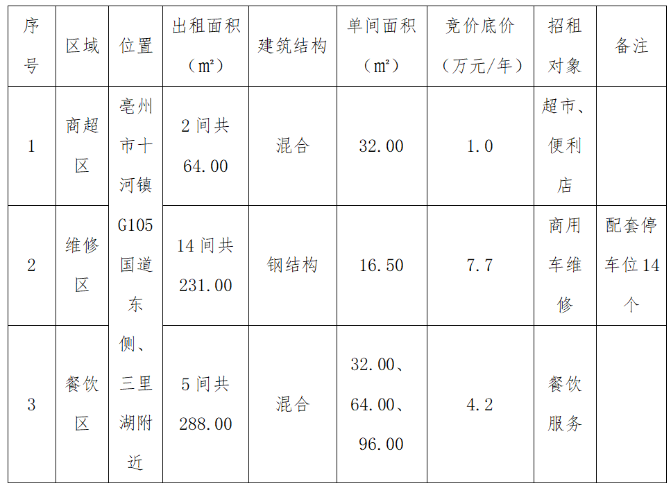 (二)招租范圍:本項目招租對象商超、汽車維修、餐飲。招租范圍及競價底價詳見下表:
