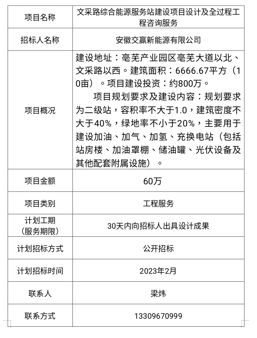 為便于潛在投標(biāo)人及時了解招標(biāo)信息,現(xiàn)將安徽交贏新能源有限公司的招標(biāo)計劃發(fā)布如下: