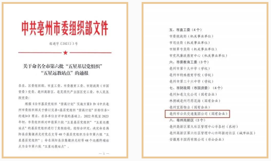 近日,亳州市委組織部印發(fā)《關(guān)于命名全市第六批“五星基層黨組織”“五星遠(yuǎn)教站點(diǎn)”的通報》。亳州公交黨總支榮獲亳州市“五星遠(yuǎn)教站點(diǎn)”稱號。