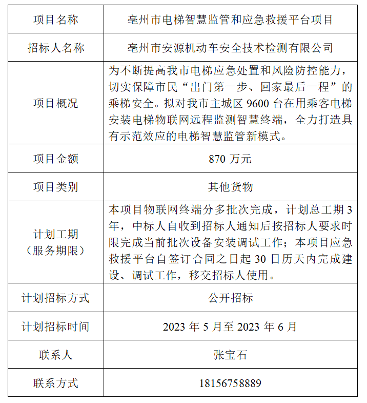 為便于潛在投標(biāo)人及時了解招標(biāo)信息,現(xiàn)將亳州市安源機(jī)動車安全技術(shù)檢測有限公司(招標(biāo)人名稱)的招標(biāo)計劃發(fā)布如下: