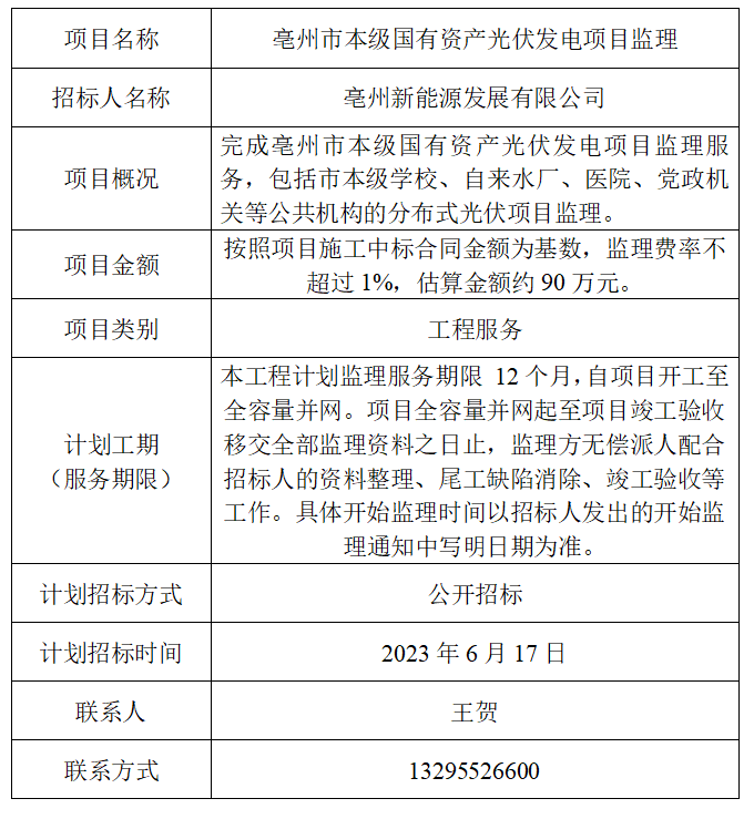 為便于潛在投標(biāo)人及時(shí)了解招標(biāo)信息,現(xiàn)將亳州新能源發(fā)展有限公司(招標(biāo)人名稱)的招標(biāo)計(jì)劃發(fā)布如下: