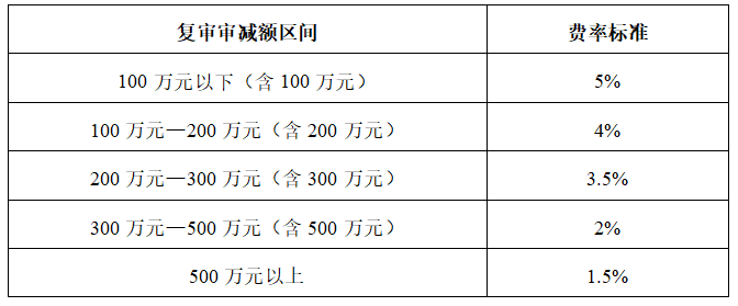 審減額費(fèi)用按“差額定率累進(jìn)法”計(jì)算,即各復(fù)審審減額區(qū)間乘以對(duì)應(yīng)費(fèi)率后綜合相加,具體區(qū)間及費(fèi)率詳見下表: