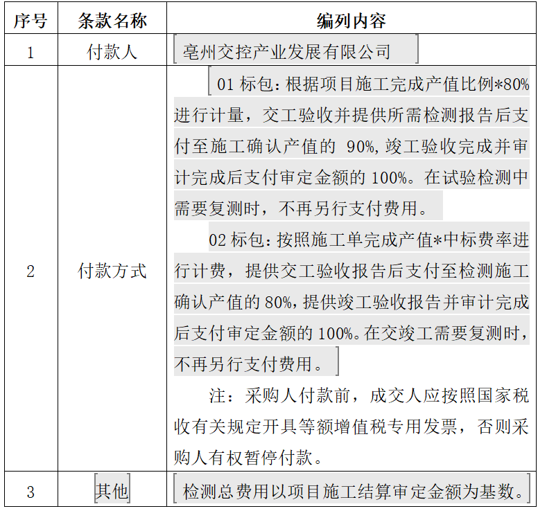 (五)最高限價(jià)(含稅):中心試驗(yàn)室1%,交竣工試驗(yàn)室0.5%。供應(yīng)商按固定費(fèi)率報(bào)價(jià),按照施工最終審定價(jià)款為基數(shù)。報(bào)價(jià)超出限價(jià)或?yàn)榭赡苡绊懞贤募s的異常低價(jià)的,按無(wú)效響應(yīng)處理;報(bào)價(jià)應(yīng)包括為完成本采購(gòu)項(xiàng)目各階段工作內(nèi)容以及后期服務(wù)所需的全部費(fèi)用及稅金;不含稅價(jià)格不因國(guó)家稅率變化而改變,在合同履行期間,如遇國(guó)家稅率調(diào)整,則價(jià)稅合計(jì)的價(jià)格應(yīng)相應(yīng)調(diào)整,以開具發(fā)票的時(shí)間為準(zhǔn)。