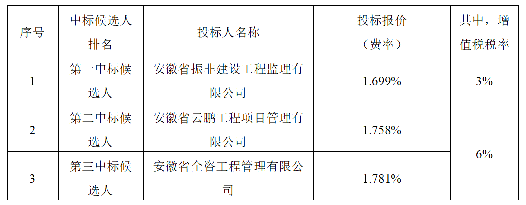 經(jīng)評(píng)審,招標(biāo)人確定安徽省振非建設(shè)工程監(jiān)理有限公司為中標(biāo)人,中標(biāo)價(jià)為以施工價(jià)款審定金額為基數(shù),費(fèi)率1.699%(其中,增值稅稅率為3%),監(jiān)理服務(wù)期自簽訂工程建設(shè)監(jiān)理合同之日起,至工程保修期滿,按合同約定完成本項(xiàng)目全部監(jiān)理工作。