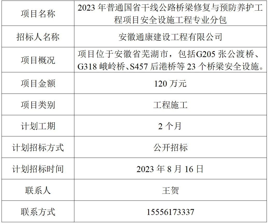 為便于潛在投標(biāo)人及時了解招標(biāo)信息,現(xiàn)將安徽通康建設(shè)工程有限公司(招標(biāo)人名稱)的招標(biāo)計劃發(fā)布如下: