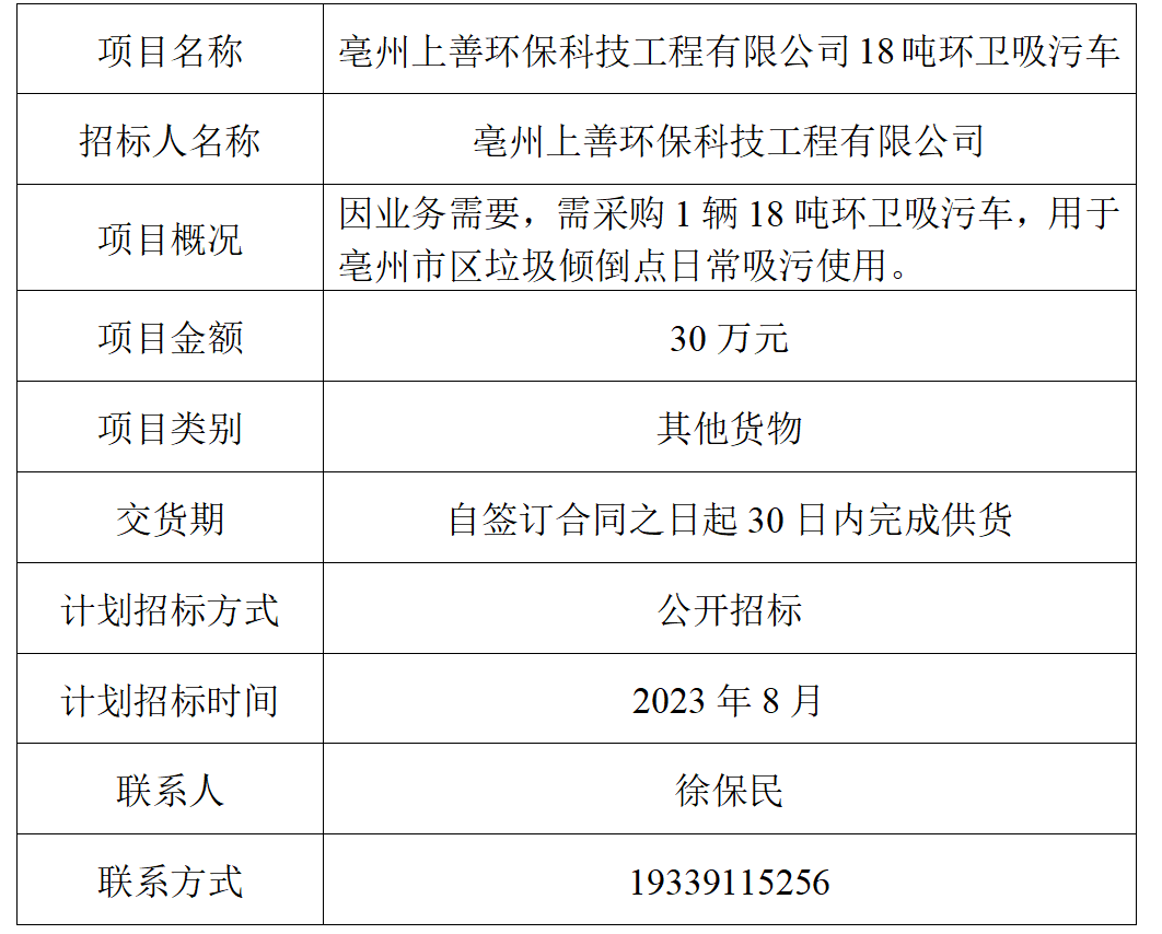 為便于潛在投標(biāo)人及時(shí)了解招標(biāo)信息,現(xiàn)將亳州上善環(huán)??萍脊こ逃邢薰?招標(biāo)人名稱)的招標(biāo)計(jì)劃發(fā)布如下: