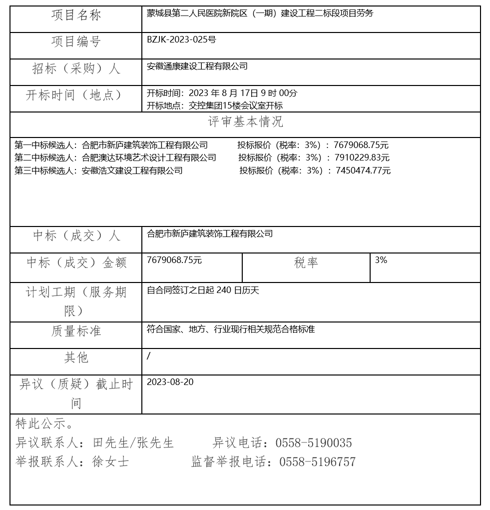 蒙城縣第二人民醫(yī)院新院區(qū)(一期)建設(shè)工程二標(biāo)段項(xiàng)目勞務(wù)中標(biāo)(成交)結(jié)果公示