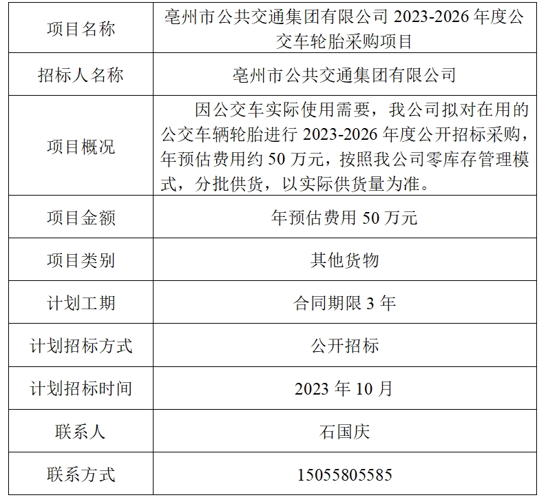 為便于潛在投標(biāo)人及時了解招標(biāo)信息,現(xiàn)將亳州市公共交通集團(tuán)有限公司(招標(biāo)人名稱)的招標(biāo)計劃發(fā)布如下: