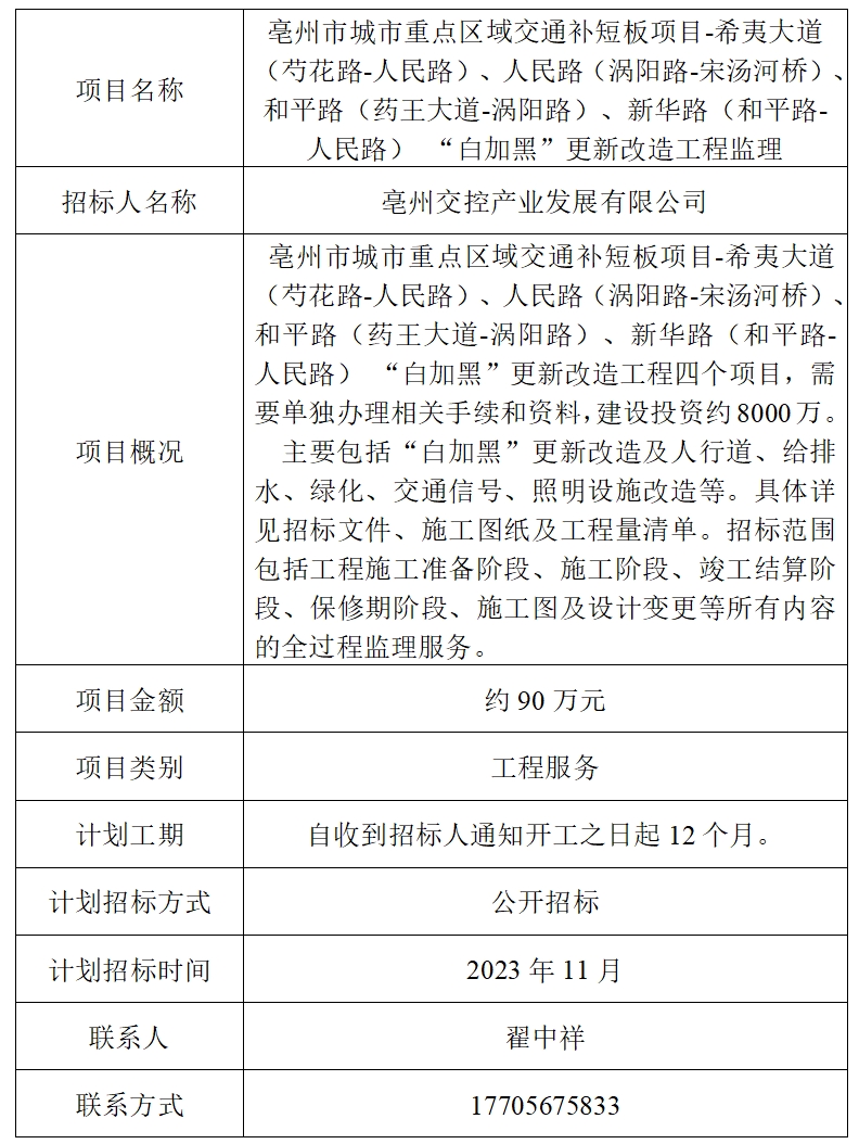 為便于潛在投標(biāo)人及時了解招標(biāo)信息,現(xiàn)將亳州交控產(chǎn)業(yè)發(fā)展有限公司(招標(biāo)人名稱)的招標(biāo)計劃發(fā)布如下: