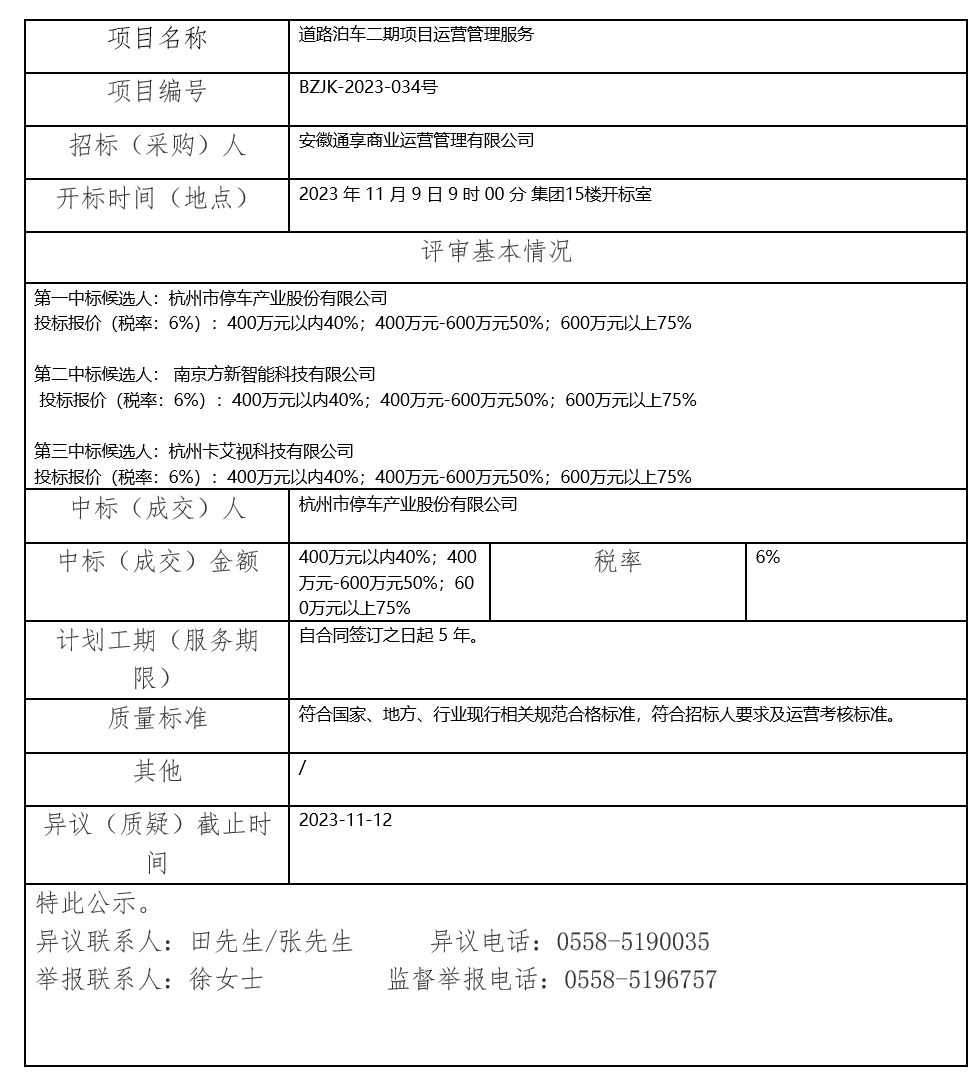道路泊車二期項目運營管理服務中標(成交)結果公示