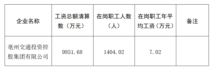 根據(jù)《亳州市市屬企業(yè)工資總額管理暫行辦法》(亳國(guó)資管〔2019〕37號(hào))有關(guān)規(guī)定,現(xiàn)將亳州交控集團(tuán)2021年度工資分配信息披露如下:
