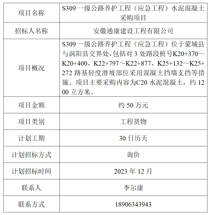 為便于潛在投標人及時了解招標信息,現(xiàn)將安徽通康建設工程有限公司(招標人名稱)的招標計劃發(fā)布如下: