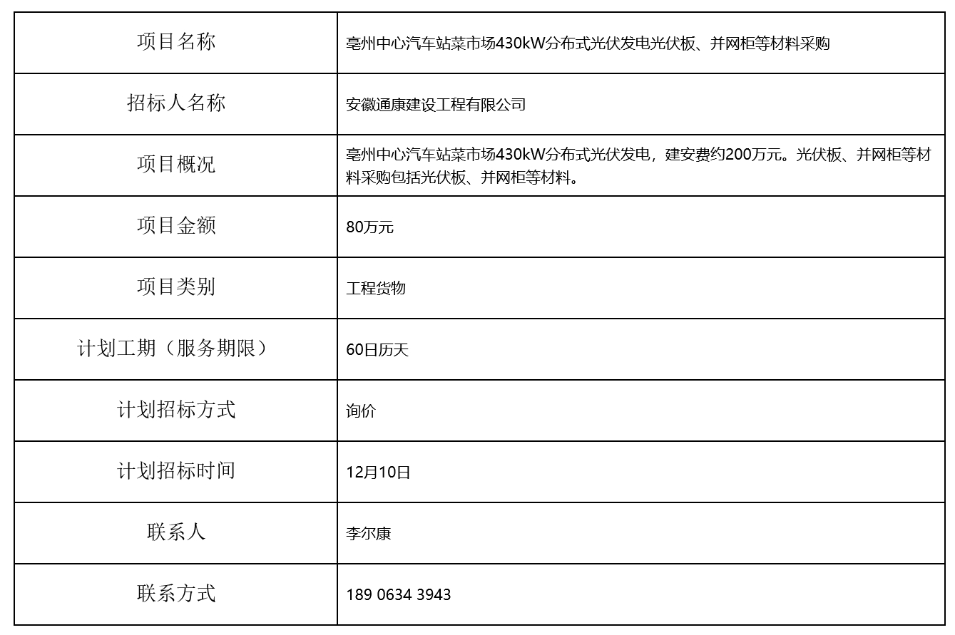 亳州中心汽車站菜市場(chǎng)430kW分布式光伏發(fā)電光伏板、并網(wǎng)柜等材料采購招標(biāo)計(jì)劃