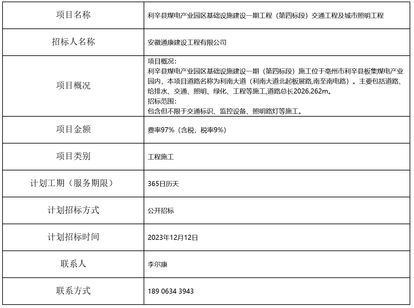 利辛縣煤電產(chǎn)業(yè)園區(qū)基礎(chǔ)設(shè)施建設(shè)一期工程(第四標段)交通工程及城市照明工程招標計劃