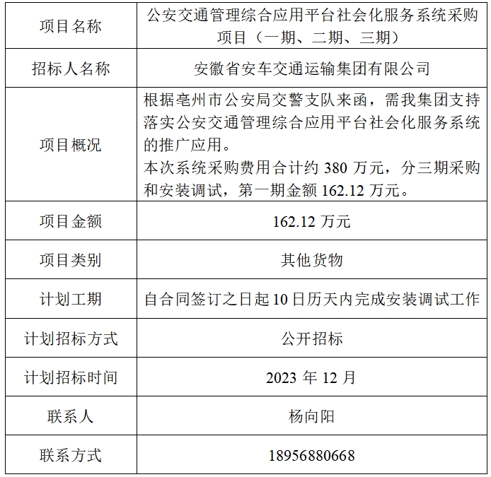 為便于潛在投標(biāo)人及時(shí)了解招標(biāo)信息,現(xiàn)將安徽省安車交通運(yùn)輸集團(tuán)有限公司(招標(biāo)人名稱)的招標(biāo)計(jì)劃發(fā)布如下: