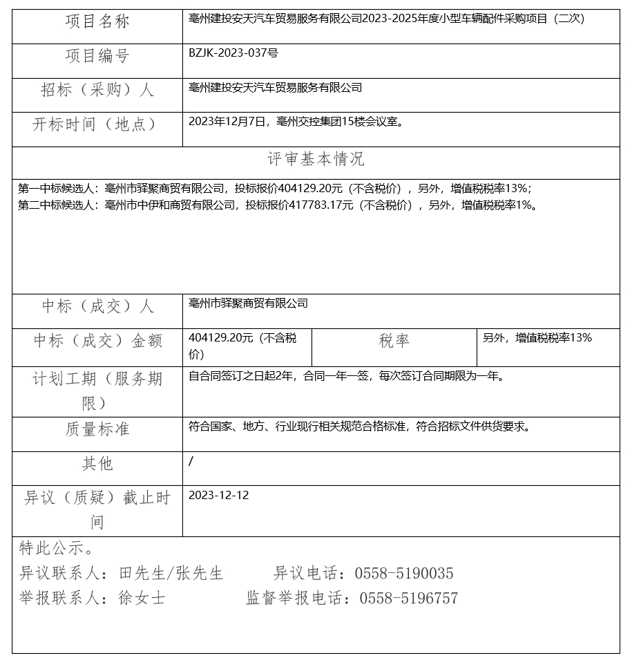 亳州建投安天汽車貿(mào)易服務(wù)有限公司2023-2025年度小型車輛配件采購項(xiàng)目(二次)中標(biāo)(成交)結(jié)果公示