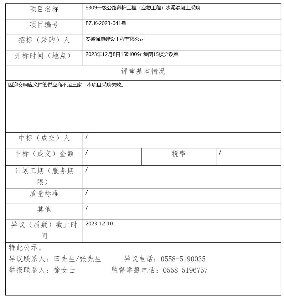 S309一級(jí)公路養(yǎng)護(hù)工程(應(yīng)急工程)水泥混凝土采購中標(biāo)(成交)結(jié)果公示