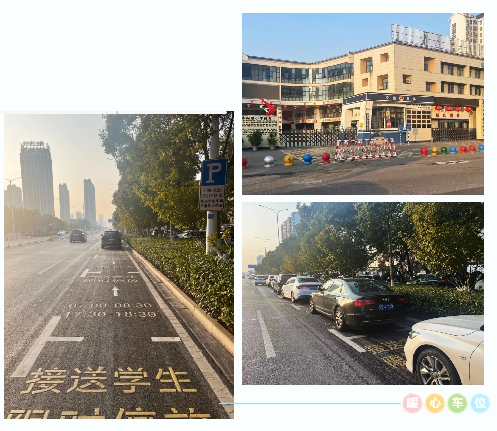 本次設(shè)立“暖心車(chē)位”在不影響現(xiàn)有公共停車(chē)泊位使用的前提下,最大限度均衡停車(chē)需求和車(chē)輛通行,在杜仲路機(jī)動(dòng)車(chē)道內(nèi)新增臨時(shí)停車(chē)泊位71個(gè),車(chē)位內(nèi)設(shè)有“接送學(xué)生、限時(shí)停放”的溫馨提示語(yǔ),并對(duì)限時(shí)停放的時(shí)間予以公示,允許停放的時(shí)間為7:00-8:30,17:30-18:30,其余時(shí)間禁止停放。