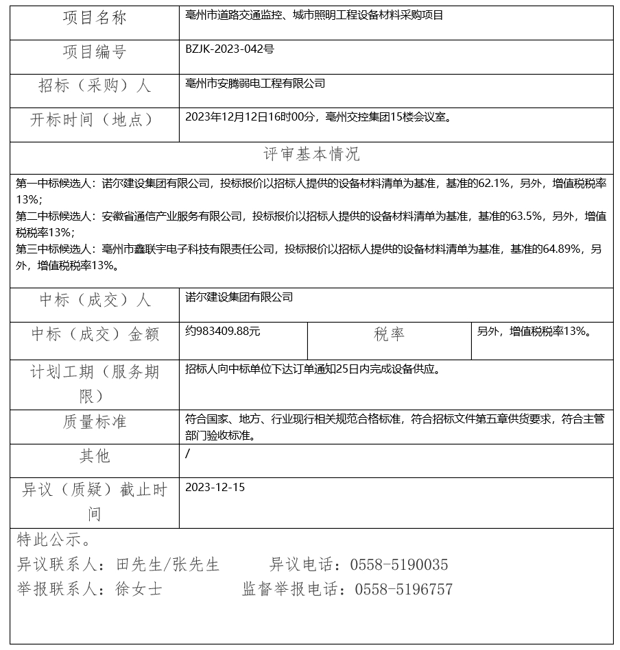 亳州市道路交通監(jiān)控、城市照明工程設(shè)備材料采購項(xiàng)目中標(biāo)(成交)結(jié)果公示