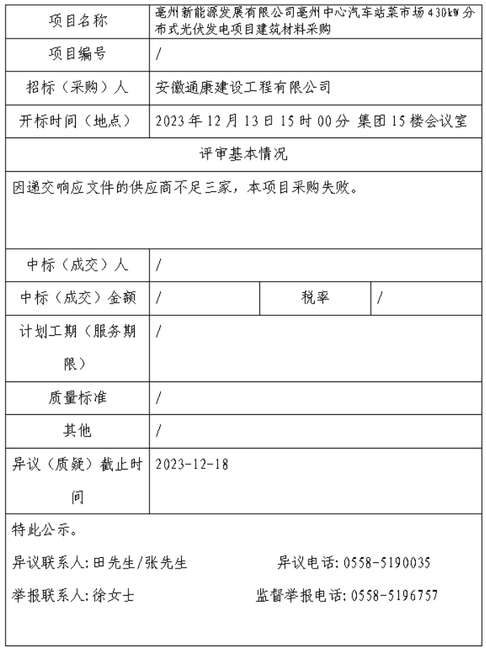 亳州新能源發(fā)展有限公司亳州中心汽車站菜市場430kW分布式光伏發(fā)電項目建筑材料采購中標(biāo)(成交)結(jié)果公示