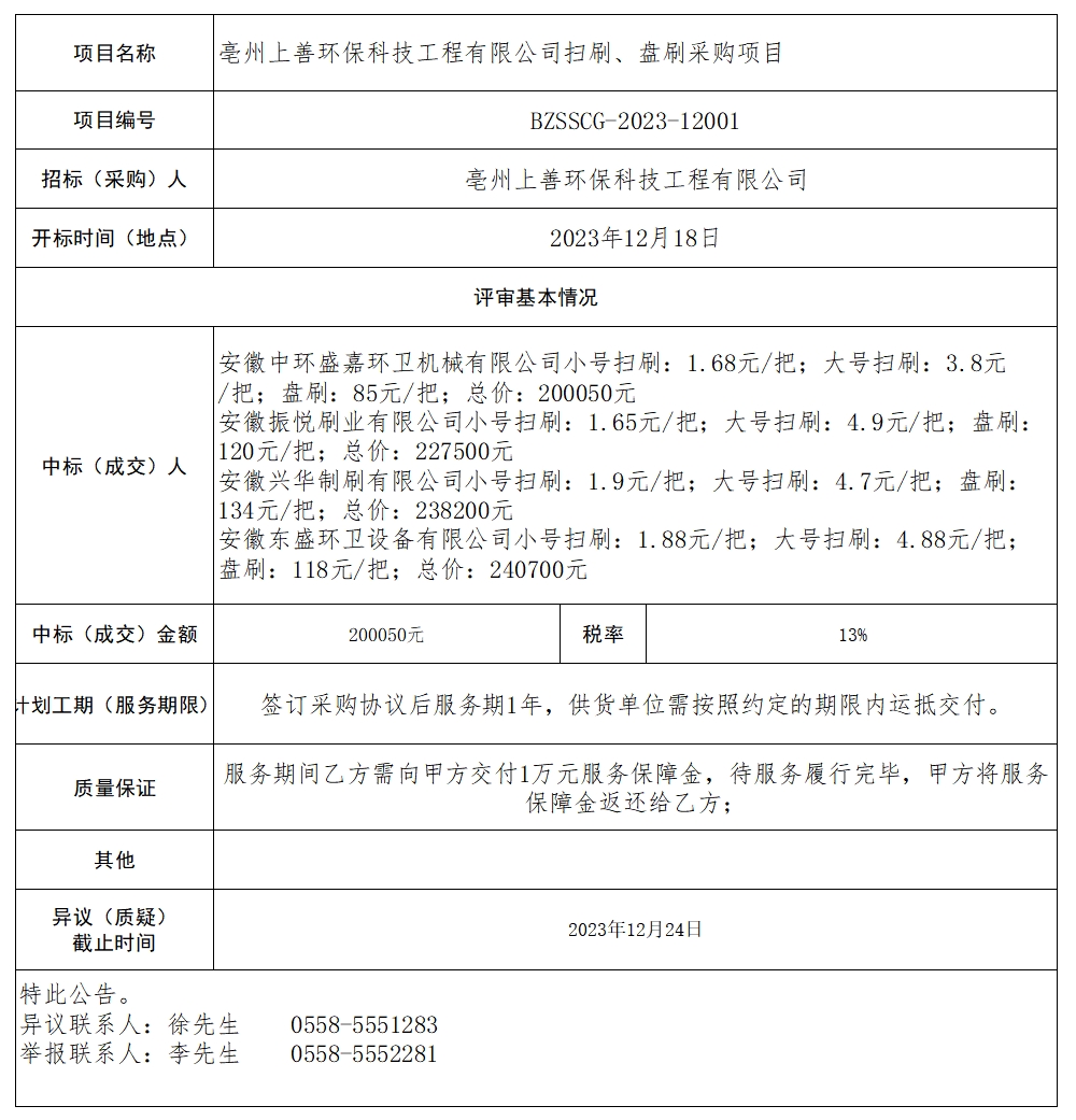 亳州上善環(huán)??萍脊こ逃邢薰緬咚?、盤刷采購項(xiàng)目中標(biāo)結(jié)果公示