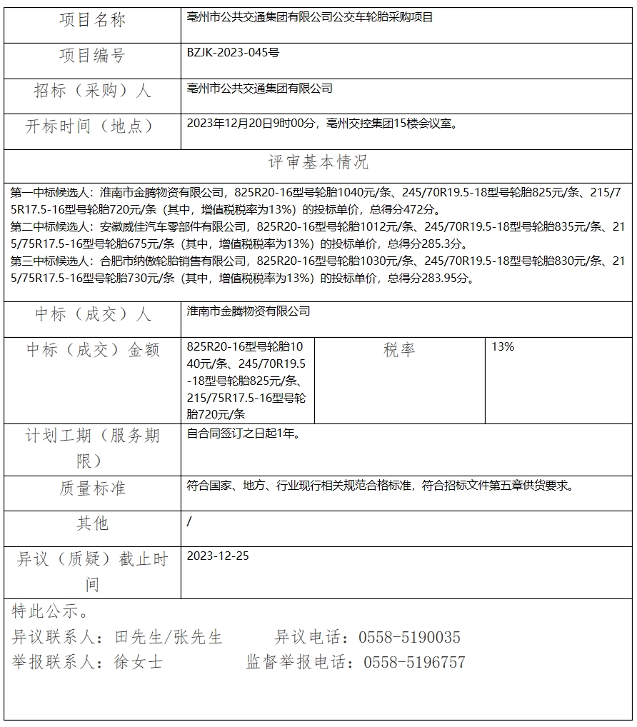 亳州市公共交通集團(tuán)有限公司公交車輪胎采購項目中標(biāo)(成交)結(jié)果公示