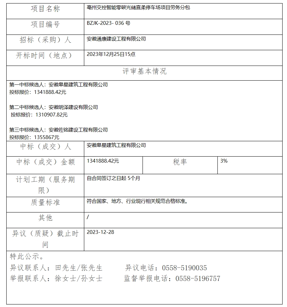 亳州交控智能零碳光儲直柔停車場項目勞務分包中標(成交)結果公示