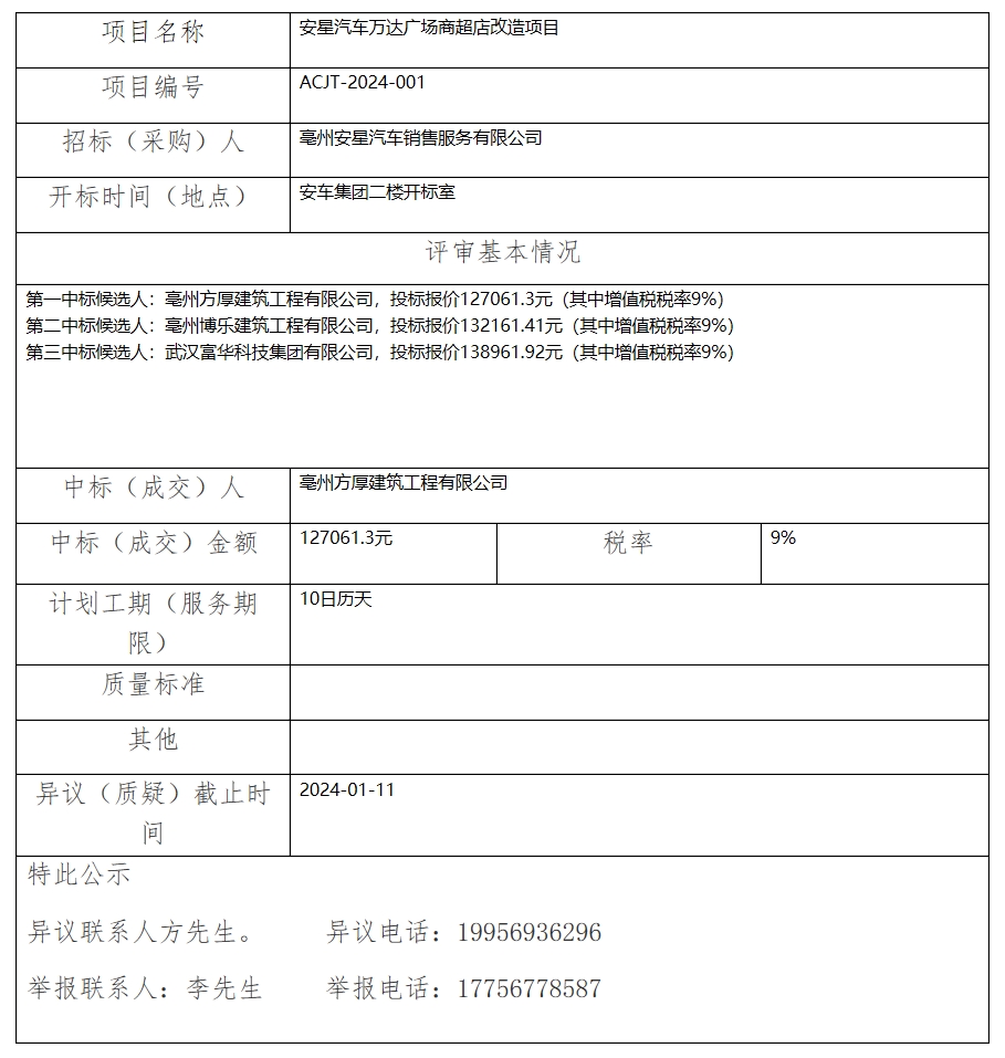 安星汽車萬達廣場商超店改造項目中標(成交)結果公示