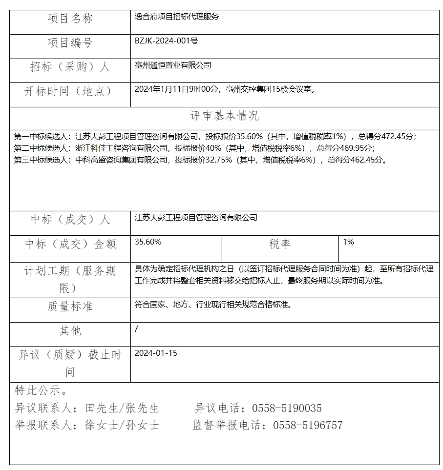 逸合府項目招標(biāo)代理服務(wù)中標(biāo)(成交)結(jié)果公示
