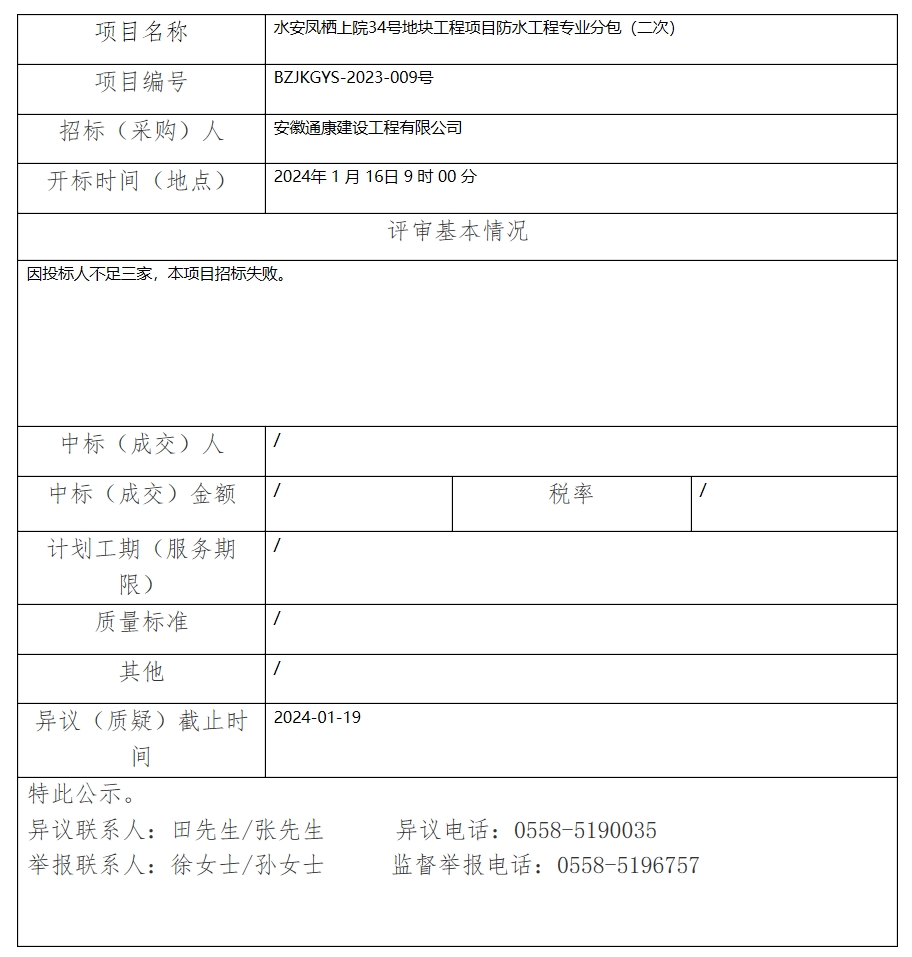 水安鳳棲上院34號地塊工程項目防水工程專業(yè)分包(二次)中標(成交)結(jié)果公示